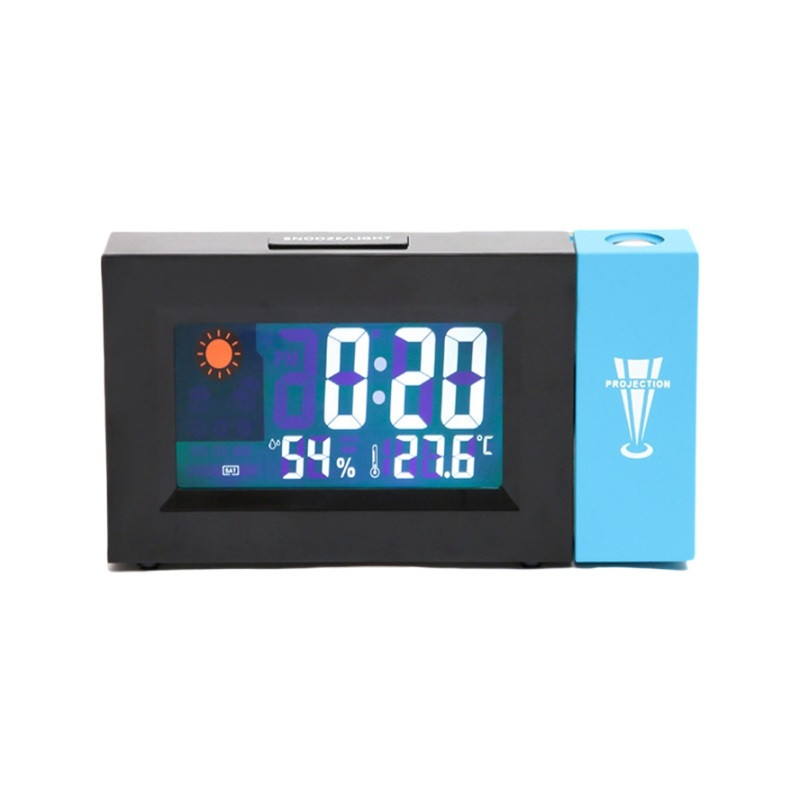 ساعت دیجیتال رومیزی دارای قابلیت های نمایش ساعت روی سقف یا دیوار ، نمایشگر وضعیت آب و هوا (ابری ، آفتابی،..) به همراه تقویم و دماسنج و رطوبت سنج و ساعت زنگدار و همینطور نمایش حداقل و حداکثر دمای اندازه گیری شده می باشد. این ساعت زمانی در شب و فضای نسبتا تاریک ساعت را بر روی سقف یا دیوار نمایش میدهد . آداپتور مورد نیاز : 5 ولت – 1 آمپر است