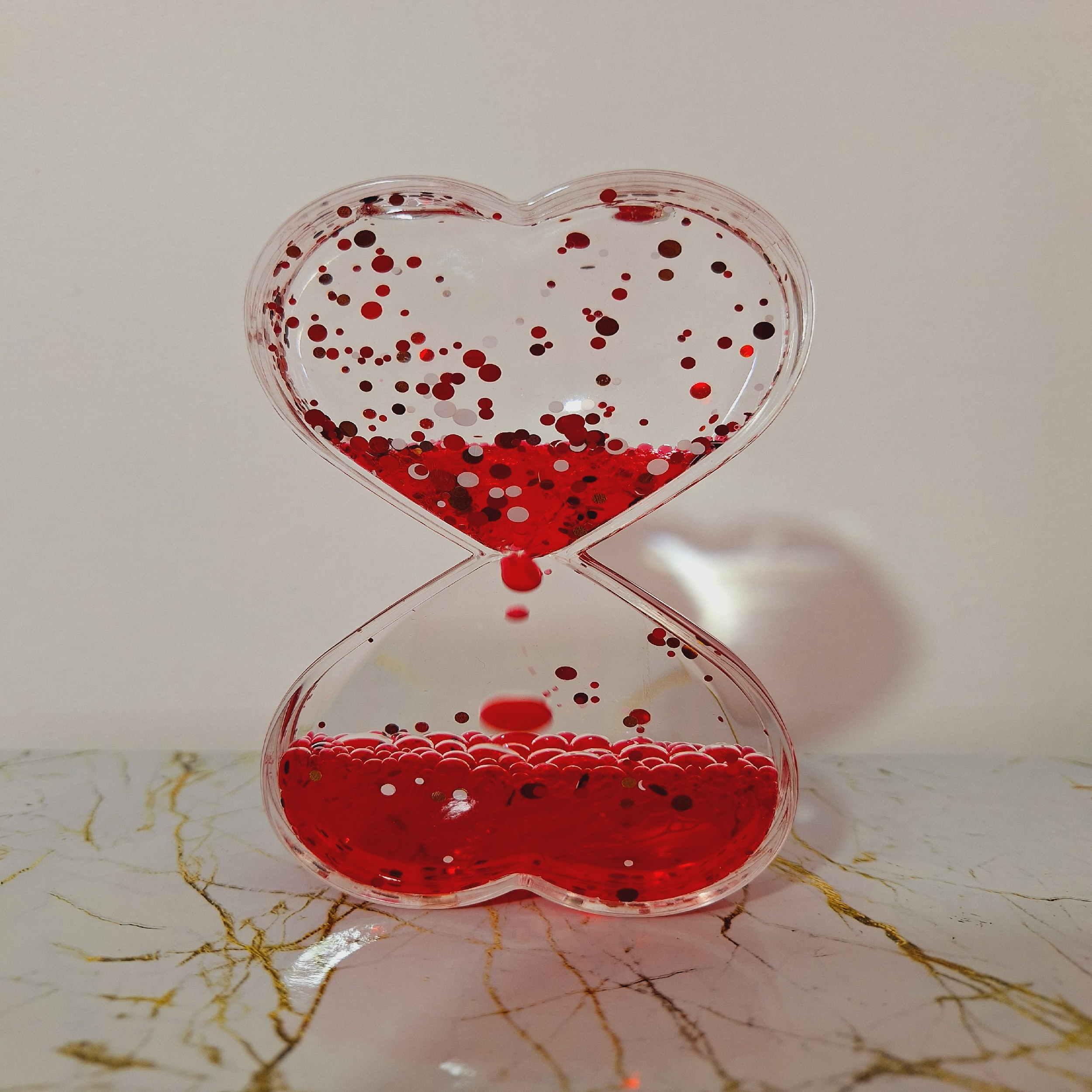 این ساعت شنی زیبا از بدنه شفاف تشکیل شده است.مایع ژله ای داخل قلب با کیفیت رنگ بالا است که وجود اکلیل های دایره ای شکل چند رنگ، زیبایی خاصی به محصول بخشیده است که همراه مایع ژله ای از بالا به پایین می چکد. این محصول به عنوان دکوری ریلکسیشن و کادویی زیبا و جذاب به شمار می آید.