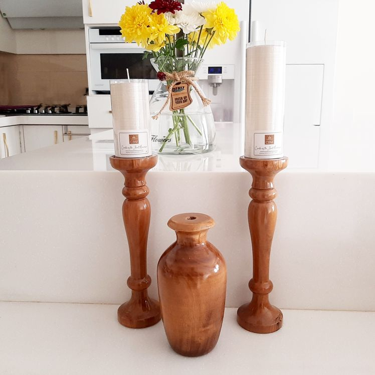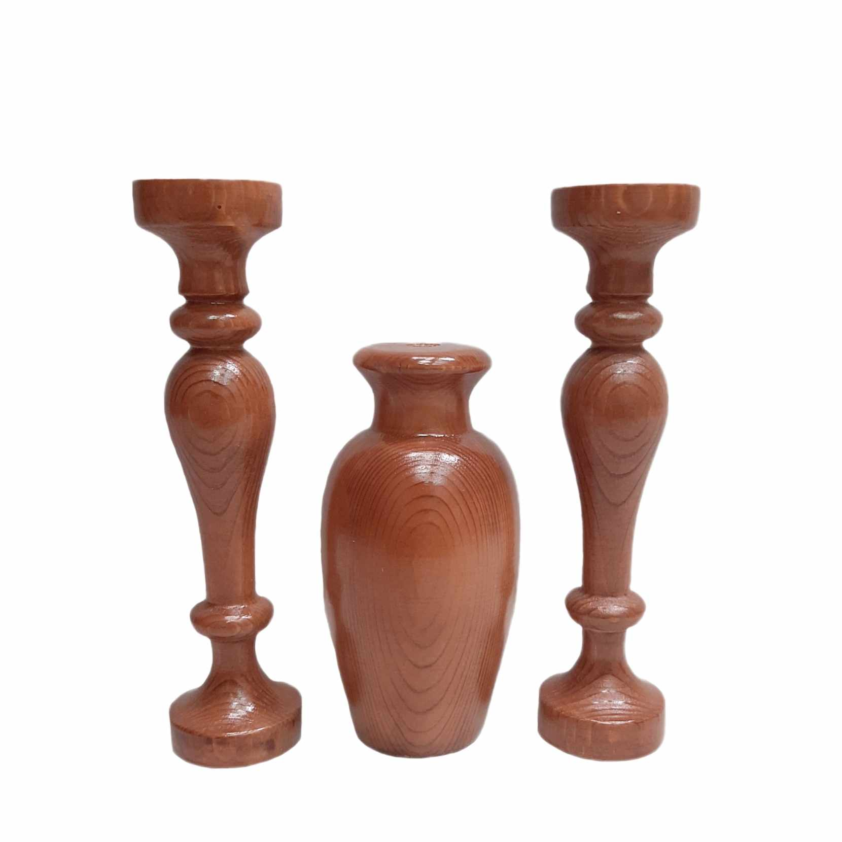 ست شمعدان و گلدان زیبای هانل از چوب فوقالعاده باکیفیت روس تهیه شده است که بوسیله پلیاستر مرغوب سطحی صیقلی براق و بسیار شکیل جهت دکوراسیون و دیزاین منازل دارد، شمعدانها هم برای شمعهای باریک و هم پهن قابلیت استفاده دارند.