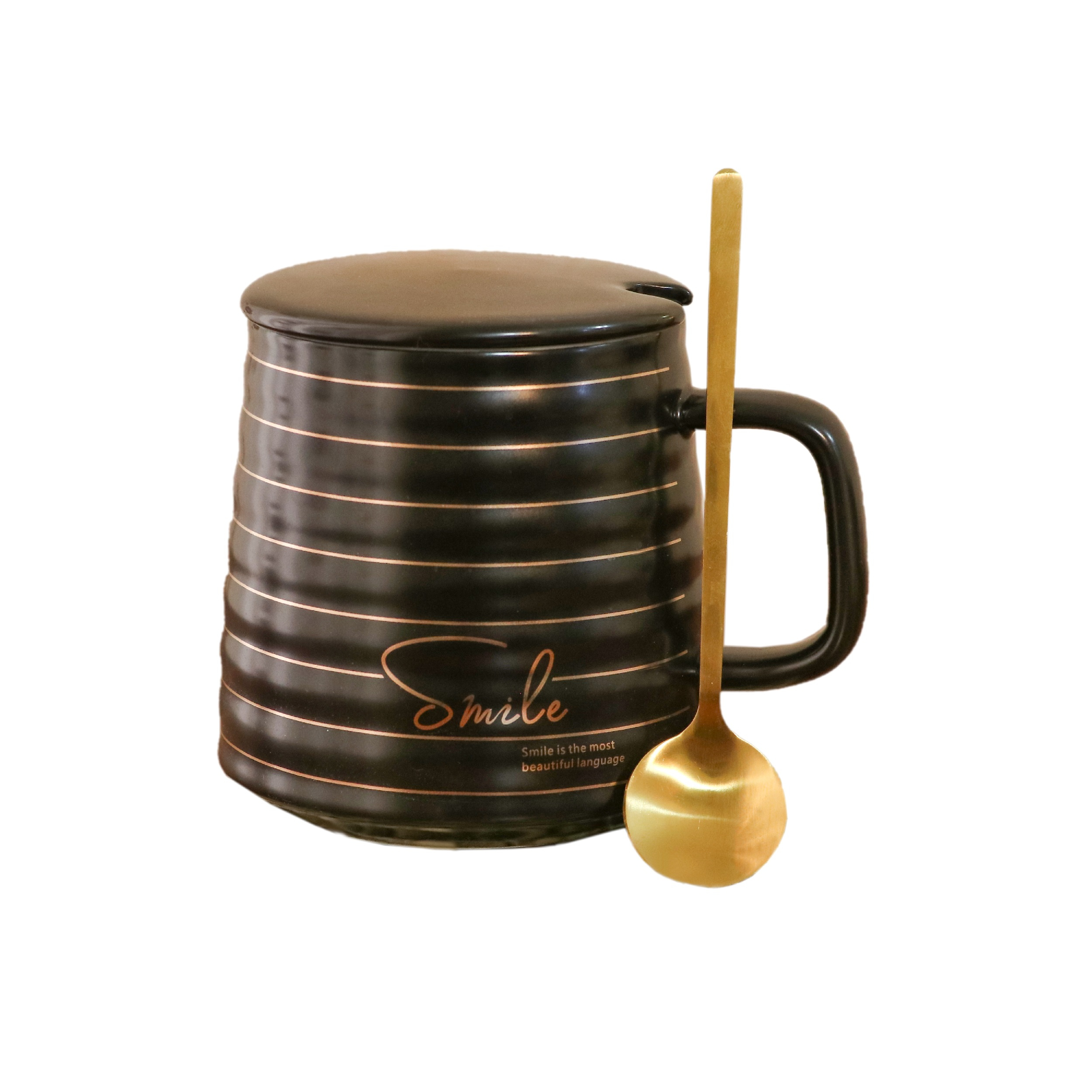 ماگ سرامیکی دربدار همراه با قاشق طلایی، طراحی شیک و بادوام، مناسب نوشیدنیهای گرم و سرد. انتخابی عالی برای خانه، محل کار و هدیه.