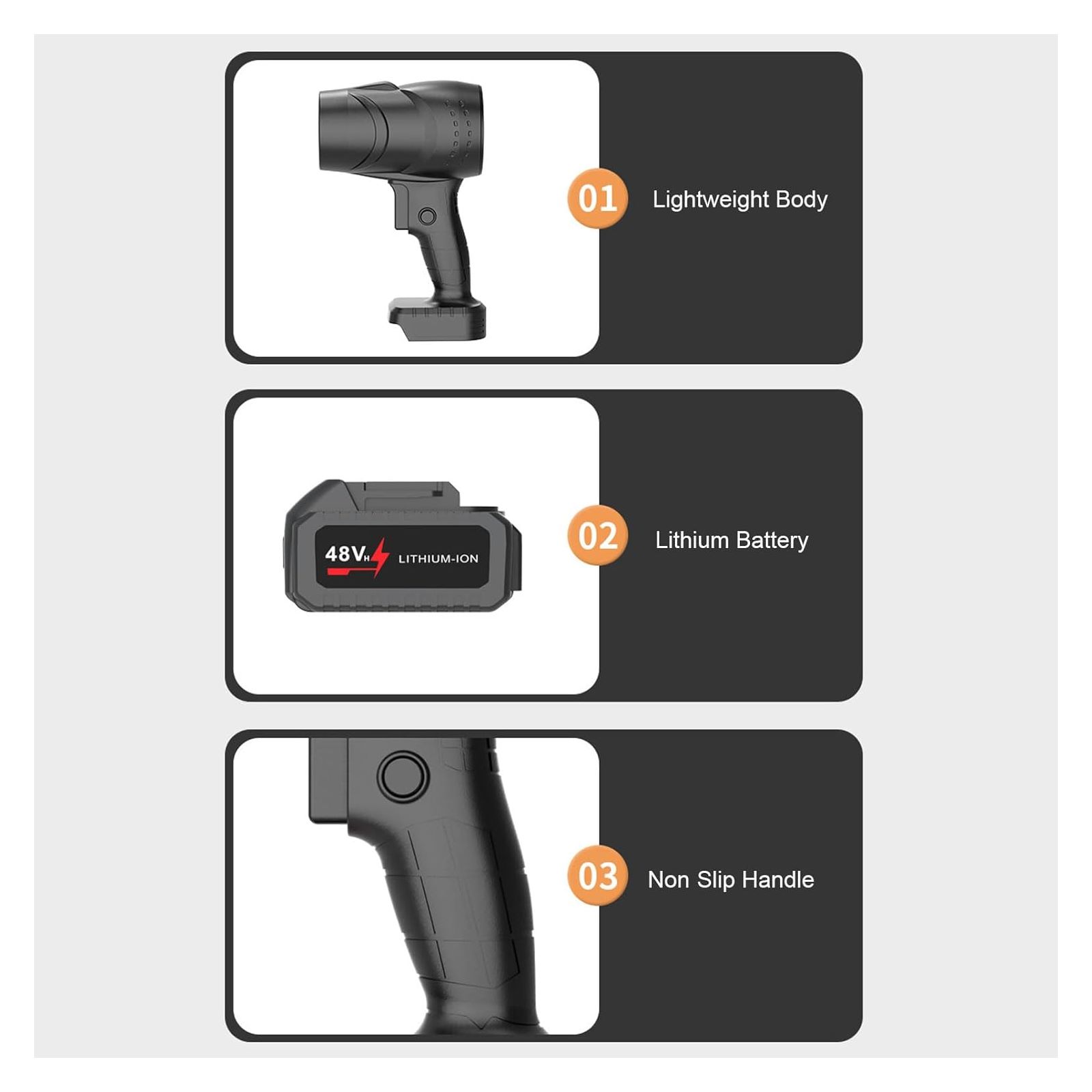 این دستگاه با باتری لیتیوم یونی ۴۸ ولت، پرتاب باد بسیار قوی و صدای کم، جایگزینی ایدهآل برای جتفنهای سیمدار محسوب میشود.