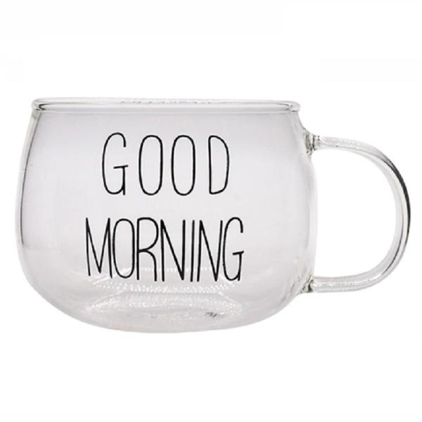 لیوان Good Morning تپل شیشهای با طراحی خاص و نوشته GOOD MORNING. مناسب نوشیدن چای، قهوه و نوشیدنیهای روزانه.