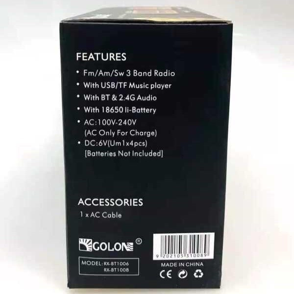 با خرید رادیو گولون RX-BT1006، همیشه به صدای با کیفیت و امکانات متنوع دسترسی خواهید داشت. همین حالا سفارش دهید و از تجربه شنیدن موسیقی و رادیو لذت ببرید.