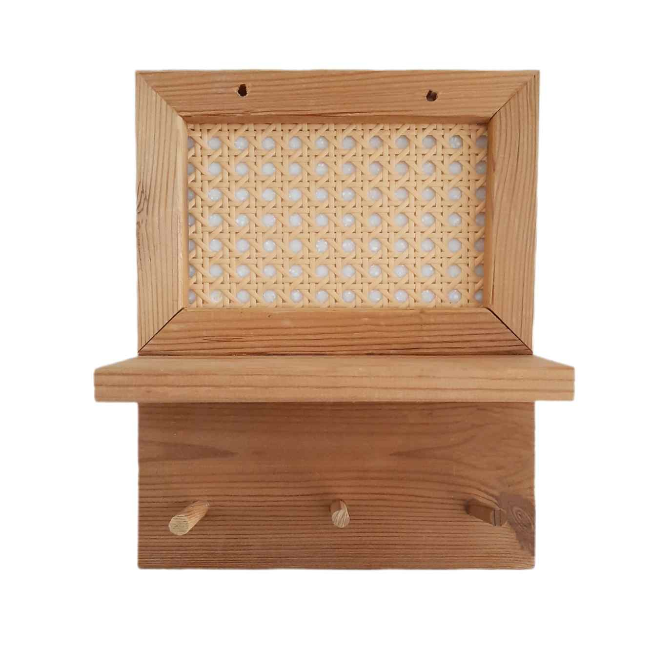 جاکلیدی دیواری چوبی طرح حصیری، ساختهشده از چوب طبیعی مقاوم. دارای قفسه کوچک و قلابهای آویز برای کلید. انتخابی شیک و کاربردی برای منزل و محل کار.