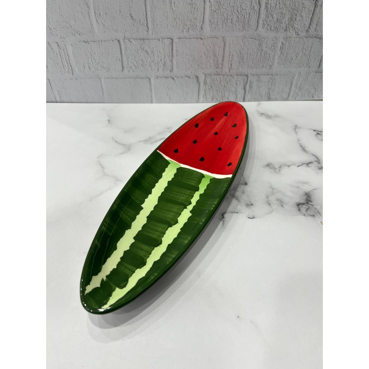 دیس بیضی طرح هندوانهای، ظرفی زیبا و فانتزی برای سرو کباب، میوه و غذاهای مختلف با طراحی خاص هندوانهای، ساختهشده از پلاستیک فشرده، مقاوم و قابل شستوشو.
