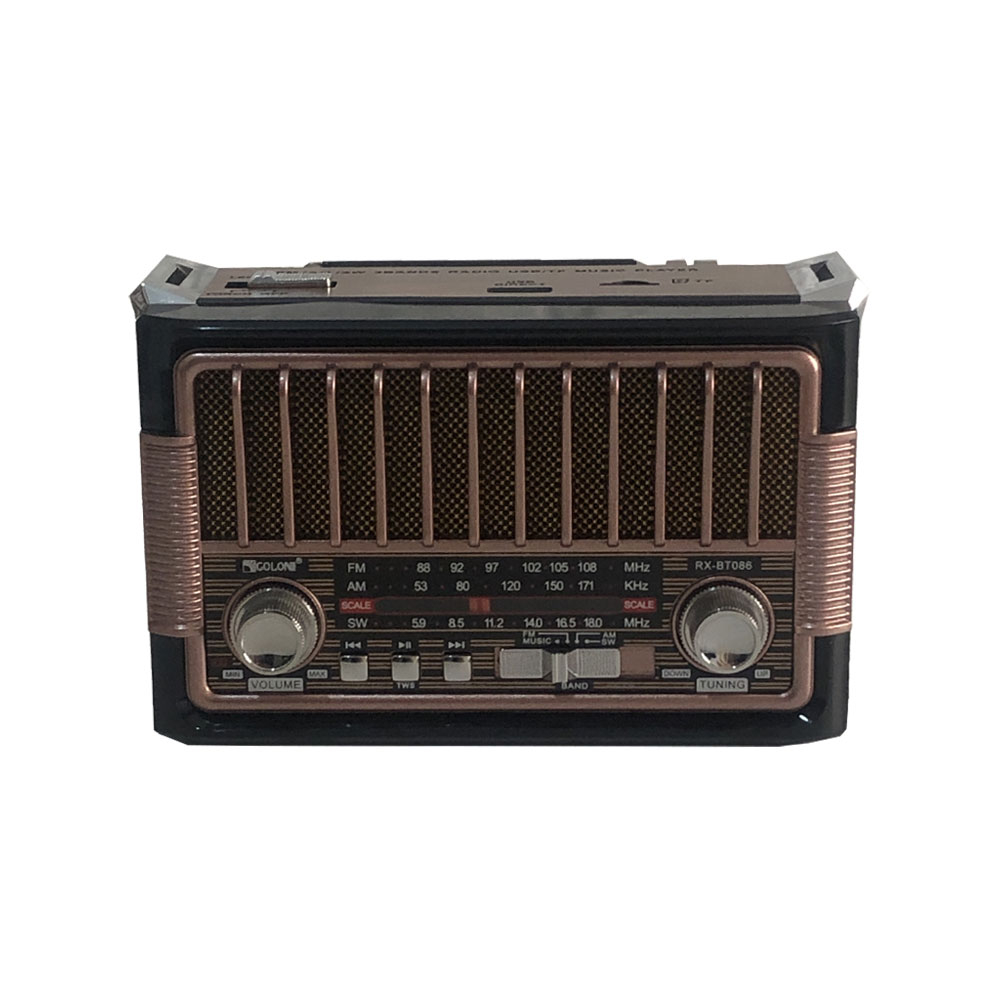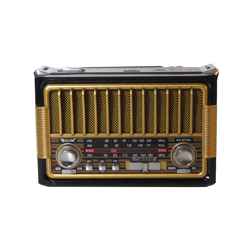 رادیو گولون مدل RX-BT086 با قابلیت بلوتوث، صدای شفاف و طراحی کلاسیک. مجهز به باتری شارژی، ورودی USB و کارت حافظه. انتخابی عالی برای سفر و استفاده روزمره.